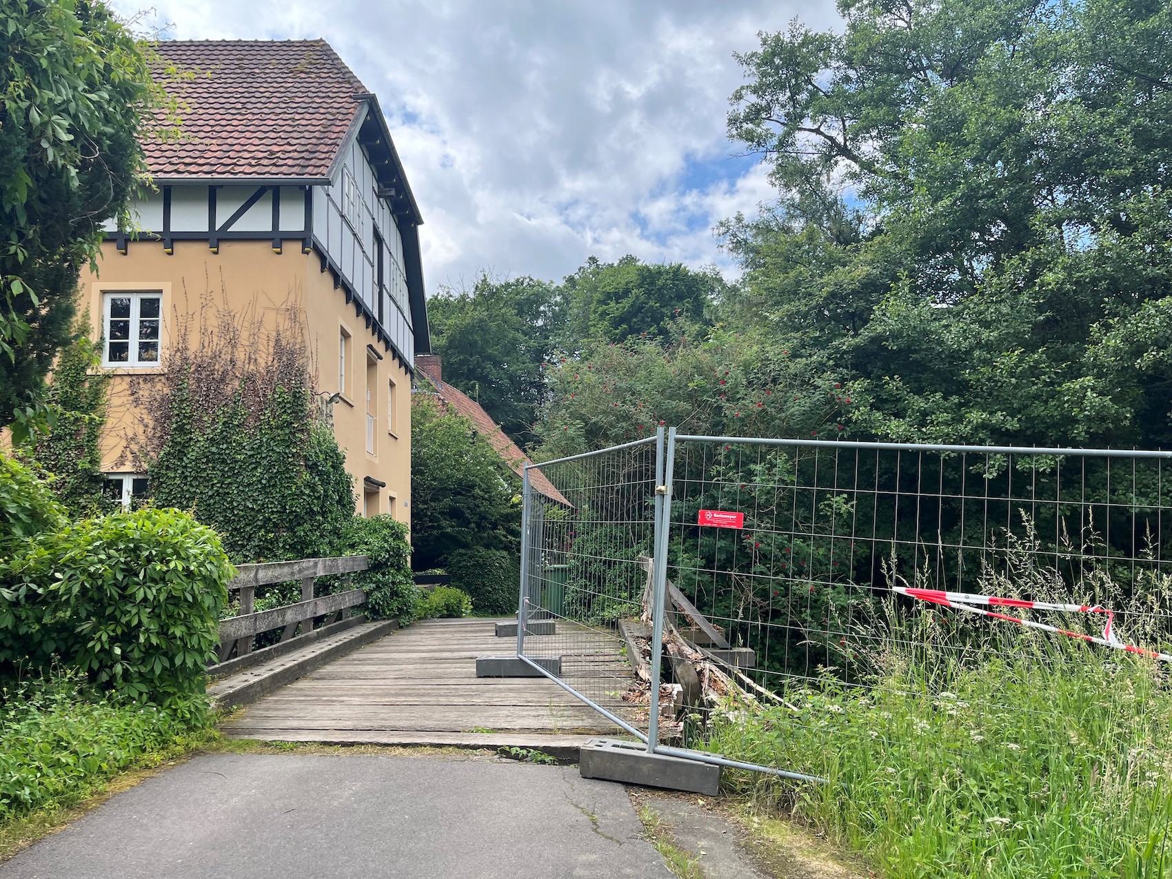 Bissendorf. Ein Bauzaun schützt das zerborstene Geländer der alten Holzbrücke über die Wierau am Waldbad Schledehausen. Die Gemeinde Bissendorf informiert, wie es dort weitergehen soll.