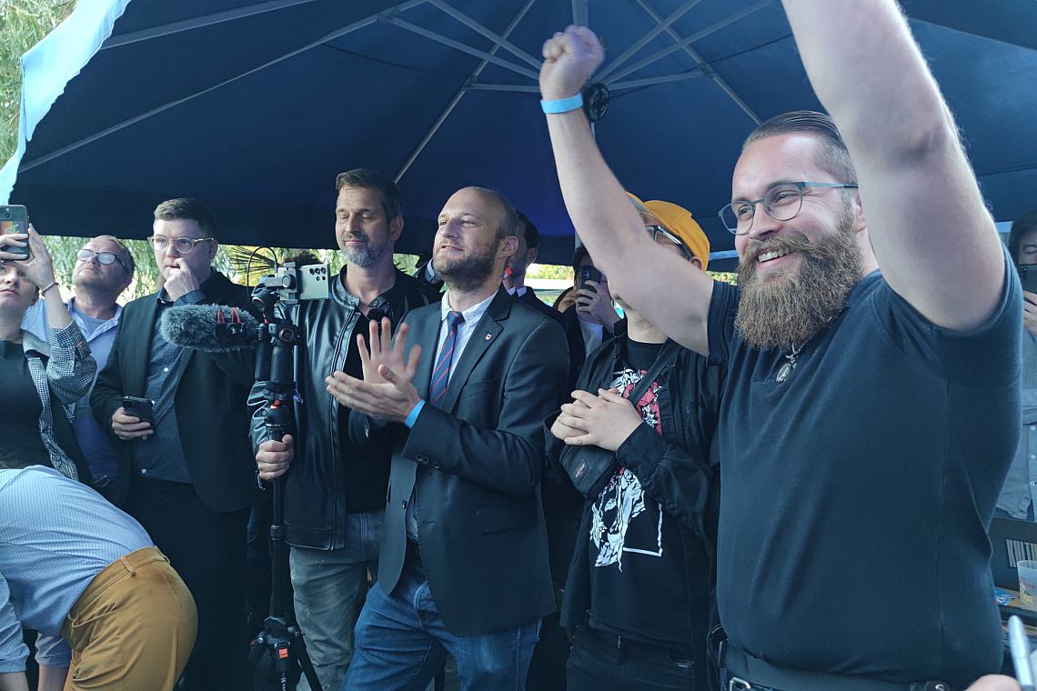 Foto: Reaktion auf 18-Uhr-Prognose bei AfD-Wahlparty in Brandenburg am 22.09.2024, via dts Nachrichtenagentur