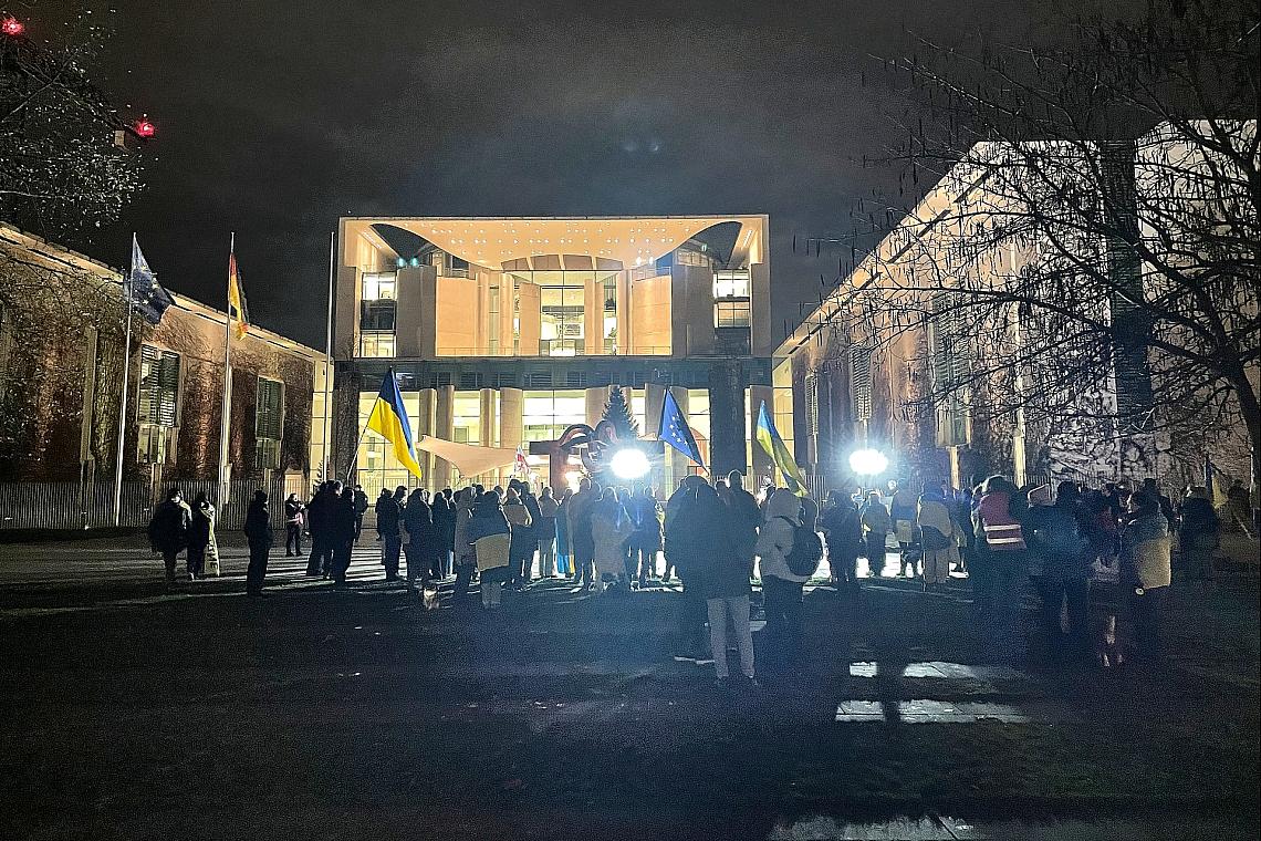 Der Ukrainekrieg dürfte trotz des 28-Punkte-Plans aus Washington wohl eine geringere Rolle bei den Gesprächen spielen. Vor dem Kanzleramt versammelte sich trotzdem eine Gruppe pro-ukrainischer Demonstranten.
